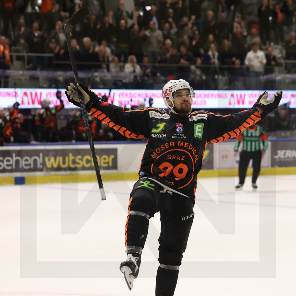 GRAZ, AUSTRIA, 15, Apr, 2026, Moser Medical Graz 99ers vs. HC Falkensteiner Pustertal. Image shows Frank HORA #3 (Moser Medical Graz 99ers) after his goal for the 3:1 lead. Photo: Werner Krainbucher
