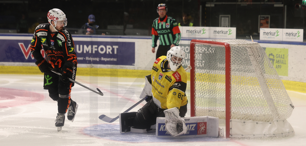 GRAZ, AUSTRIA, 15, Apr, 2026, Moser Medical Graz 99ers vs. HC Falkensteiner Pustertal. Image shows Kevin Michael CONLEY #22 (Moser Medical Graz 99ers) & Edward Robert Nito PASQUALE #80 (HC Falkensteiner Pustertal). Photo: Werner Krainbucher