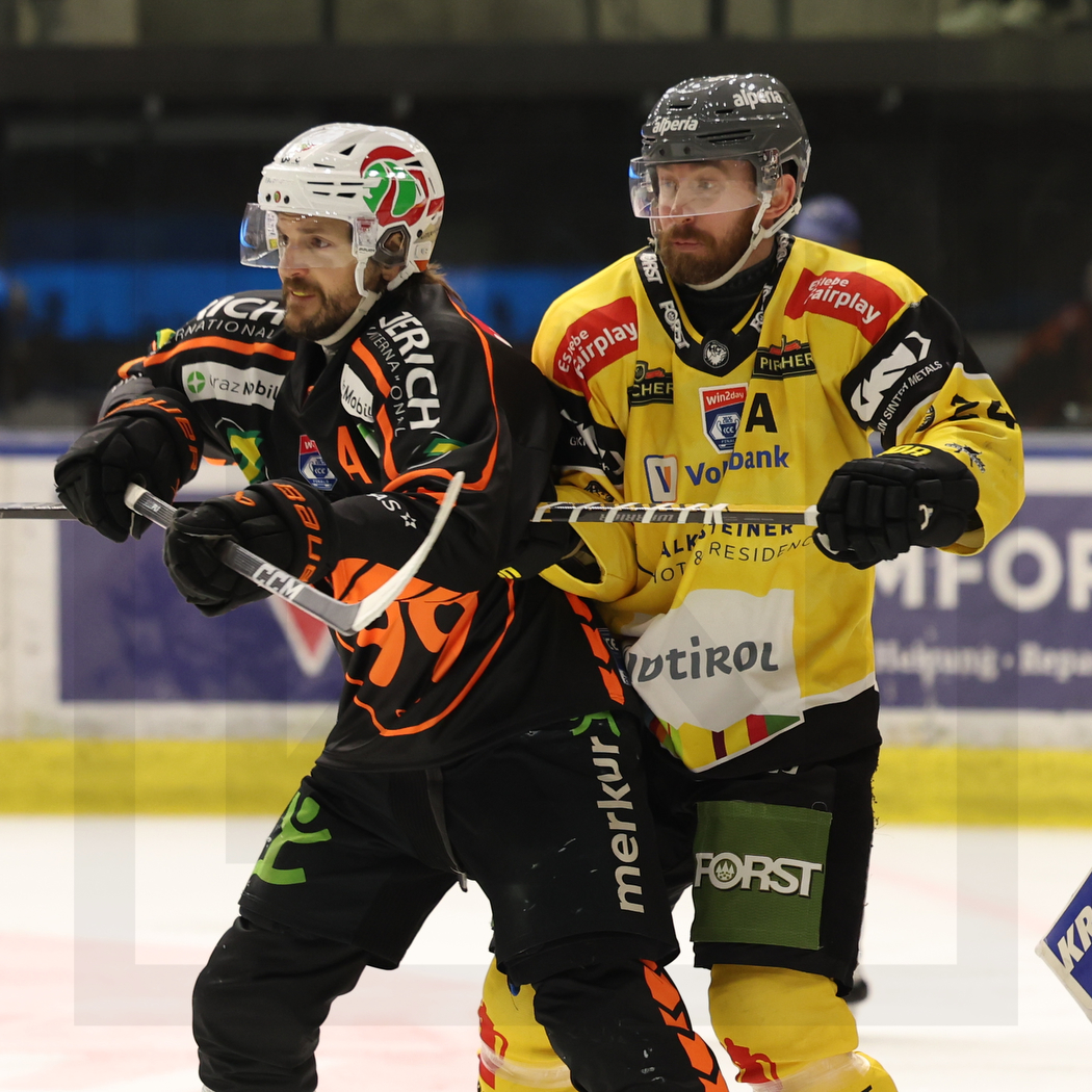 GRAZ, AUSTRIA, 19, Apr, 2026, Moser Medical Graz 99ers vs. HC Falkensteiner Pustertal. Image shows Manuel GANAHL #17 (Moser Medical Graz 99ers) & Jonathon BLUM #24 (HC Falkensteiner Pustertal). Photo: Werner Krainbucher