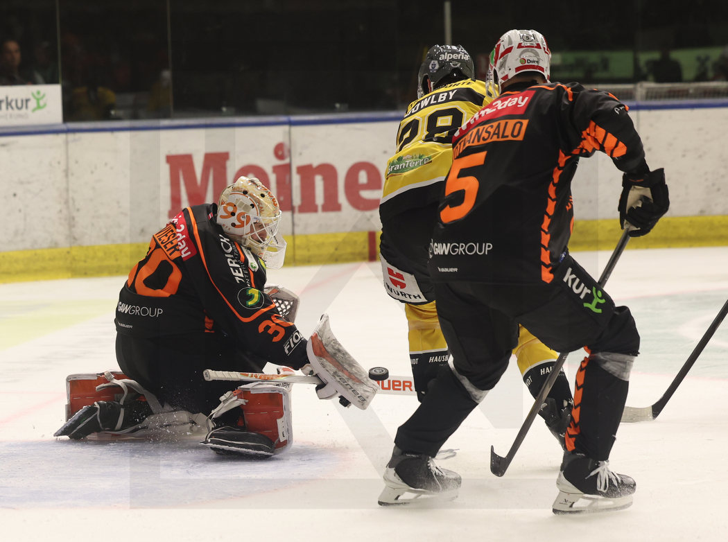 GRAZ, AUSTRIA, 19, Apr, 2026, Moser Medical Graz 99ers vs. HC Falkensteiner Pustertal. Image shows Nicolas WIESER #30 (Moser Medical Graz 99ers), Henry BOWLBY #28 (HC Falkensteiner Pustertal) / Kasper Aleksanteri KOTKANSALO #5 (Moser Medical Graz 99ers). Photo: Werner Krainbucher