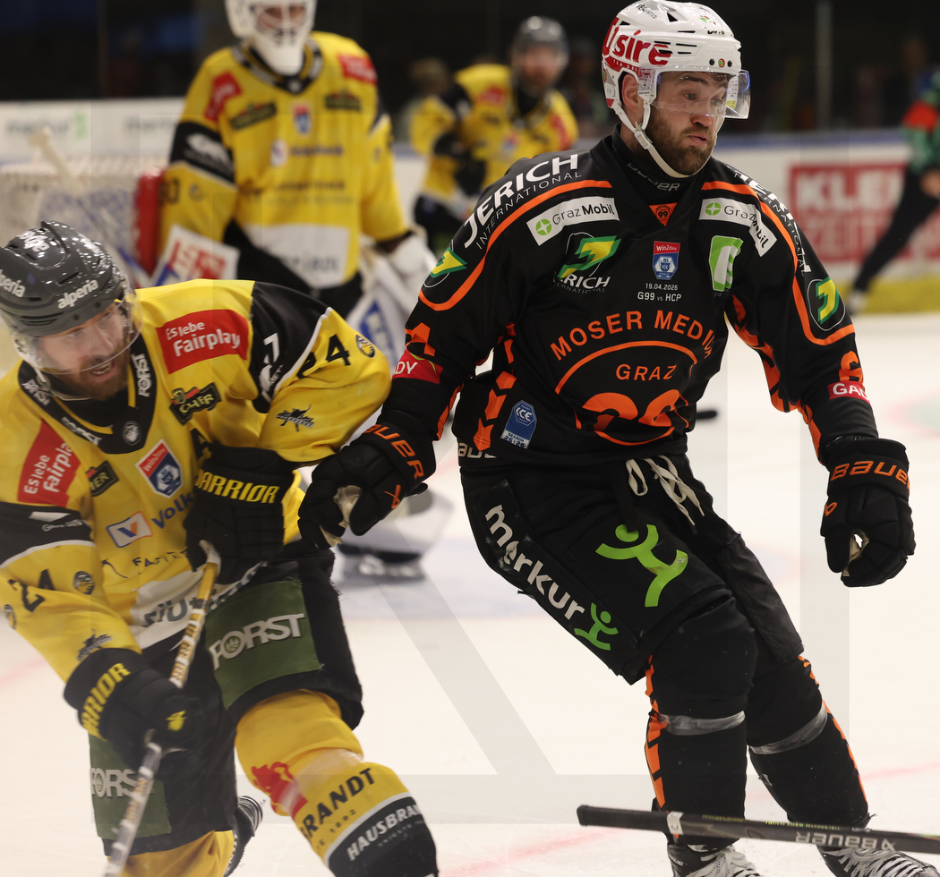 GRAZ, AUSTRIA, 19, Apr, 2026, Moser Medical Graz 99ers vs. HC Falkensteiner Pustertal. Image shows Jonathon BLUM #24 (HC Falkensteiner Pustertal) & Josh CURRIE #64 (Moser Medical Graz 99ers). Photo: Werner Krainbucher