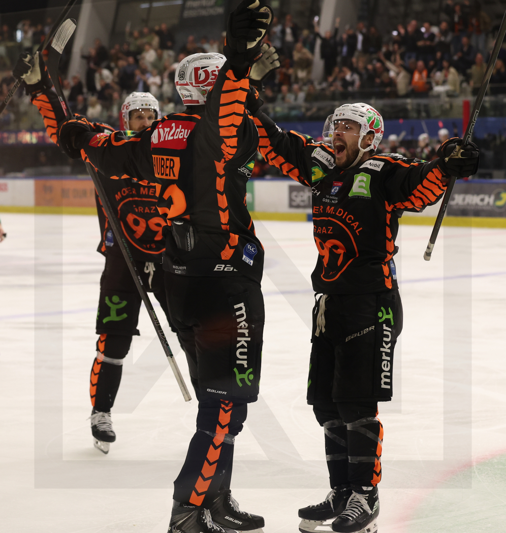 GRAZ, AUSTRIA, 19, Apr, 2026, Moser Medical Graz 99ers vs. HC Falkensteiner Pustertal. Image shows Korbinian HOLZER #4 (Moser Medical Graz 99ers), Paul HUBER #52 (Moser Medical Graz 99ers) & Nick SWANEY #55 (Moser Medical Graz 99ers). Photo: Werner Krainbucher