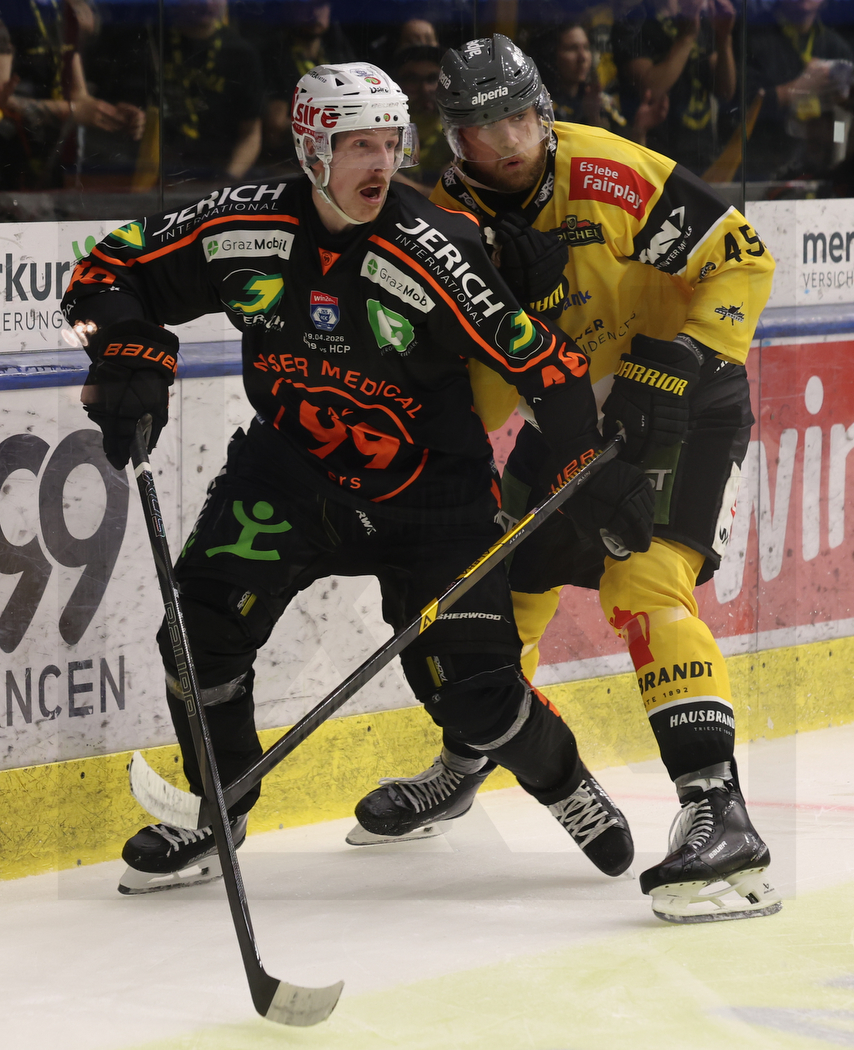 GRAZ, AUSTRIA, 19, Apr, 2026, Moser Medical Graz 99ers vs. HC Falkensteiner Pustertal. Image shows Anders KOCH #46 (Moser Medical Graz 99ers) & Austin RUESCHHOFF #45 (HC Falkensteiner Pustertal). Photo: Werner Krainbucher